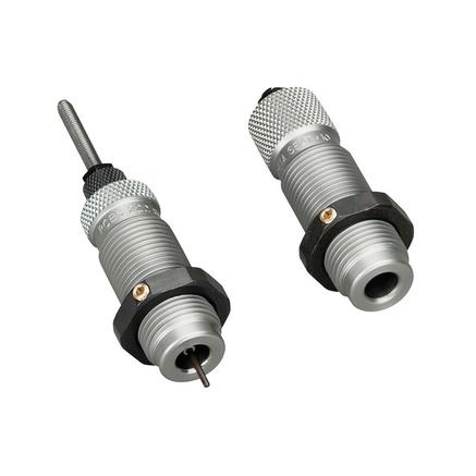 This two-die set is intended for reloading bottleneck cases, and consists of a Full-Length Sizer Die with an Expander-Decapping Unit, and a Seater Die with Bullet Seater Plug. The Full-Length Sizer Die brings the case to SAAMI minimum cartridge dimensions. It sizes the outside of the case, de-primes and expands the neck to accept the bullet. The die has vents to prevent case damage caused by trapped air and for excessive lubricant. Headspace is held to minimum tolerances to avoid changing the case body length during full length sizing. The included Seater Die has a built-in roll crimper to secure the bullet at the same time as it
