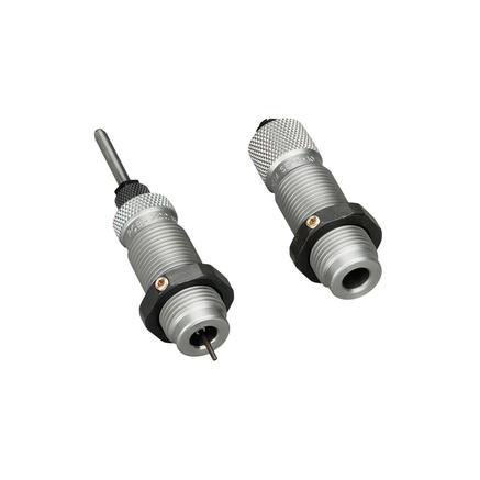 These two die-sets are intended for reloading bottleneck cases, and consist of a Full-Length Sizer Die with an Expander-Decapping Unit, and a Seater Die with Bullet Seater Plug. The Full-Length Sizer Die brings the case to SAAMI minimum cartridge dimensions. This die sizes the outside of the case, de-primes, and expands the neck to accept the bullet. The die has vents to prevent case damage caused by trapped air and excessive lubricant. Headspace is held to minimum tolerances to avoid changing the case body length during full-length sizing. The included Seater Die has a built-in roll crimper to secure the bullet at the same time as it's seated