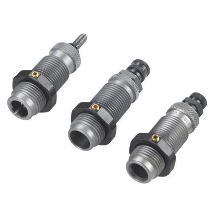 RCBS pioneered and developed 3-Die Sets for straight-wall rifle and pistol cases. The Carbide Sizer Die sizes the case and de-primes (the carbide sizer ring eliminates the need to lubricate). The Expander Die expands the case to the proper diameter to accept the bullet, and it imparts case mouth flare/bell for bullet feeding. The Seater Die seats the bullet and roll crimps.