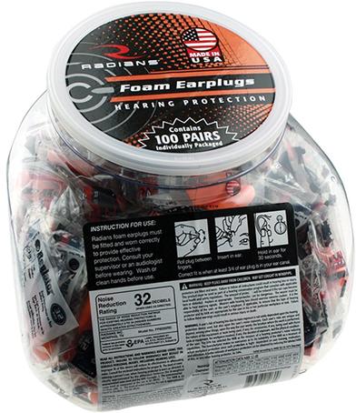 Radians 100 pairs of Uncorded Foam Earplugs in Poly Bags in a Jar