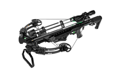 The sleek CenterPoint Amped 425 Crossbow with Silent Crank generates an incredible amount of power while staying compact and maneuverable. Measuring only 12" axle-to-axle when cocked, it delivers crushing speeds of up to 425 feet per second and includes features a folding stirrup and silent cranking device for ultra stealth.