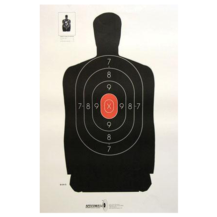 Upgrade your practice shots with the perfect target: the Speedwell Targets Police Silhouette B34G Target Reduced B-27! This box of 100 targets features a 25 yard red center, and 19 inch width x 27 inch height dimension.