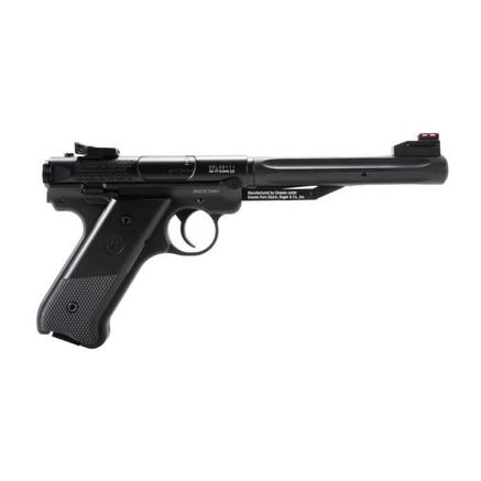 Ruger's classic Mark Series pistols have been popular for well over 50 years. Finally, you can pass on the shooting tradition of Ruger's time-honored design to your family with the Ruger Mark IV .177 caliber pellet pistol. Umarex is paying homage to this cornerstone of Ruger design by applying the classic Ruger style to a smooth operating break barrel pellet pistol. Notably, this sweet plinker features adjustable fiber-optic sights, an automatic/manual thumb safety, and grips with combination smooth and checkered surfaces. Get stocked up with plenty of pellets and targets because you are going to need them with this fun plinker. Manufactured by Umarex under license from Sturm, Ruger & Co. Inc.