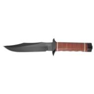 For those who are looking for the style of the SOG Bowie with a modern treatment, look no further than the Tech Bowie. The Tech Bowie has morphed into a top-notch work knife with the use of modern technology and materials. All the metal parts and including the blade, crossguard and pommel are hardcased black TiNi coated. The tactile Kraton rubble handle give a contemporary touch to the traditional leather washers. The thick (0.24") AUS-8 blade is topped off the same blade grind as the SOG Bowie. The sculpted crossguard, deep hollow grinds and precision detailing, and faceted tip are unmistakable signatures of SOG.