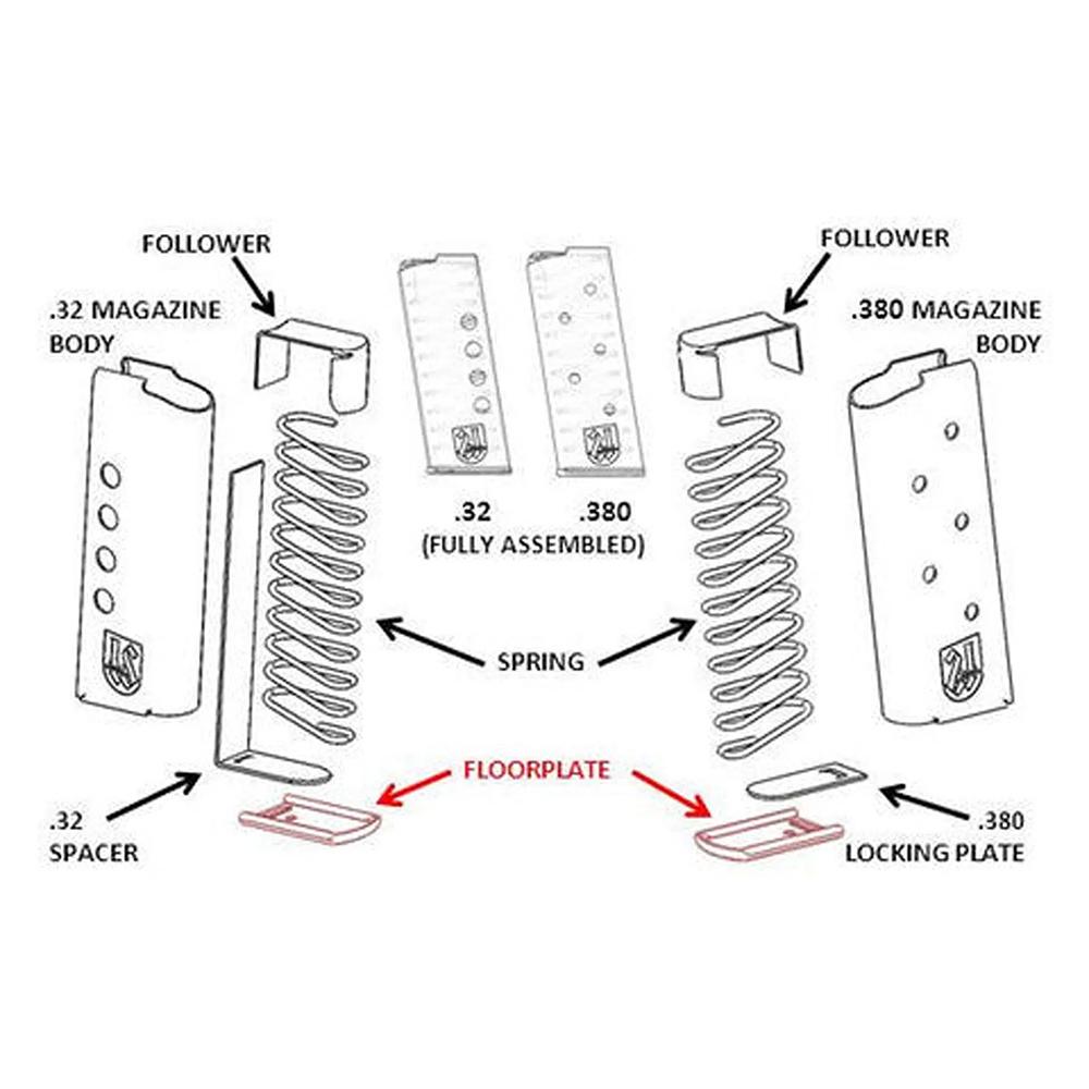 To install simply replace the floor plate of the magazine assembly with the magazine extension (see exploded view)