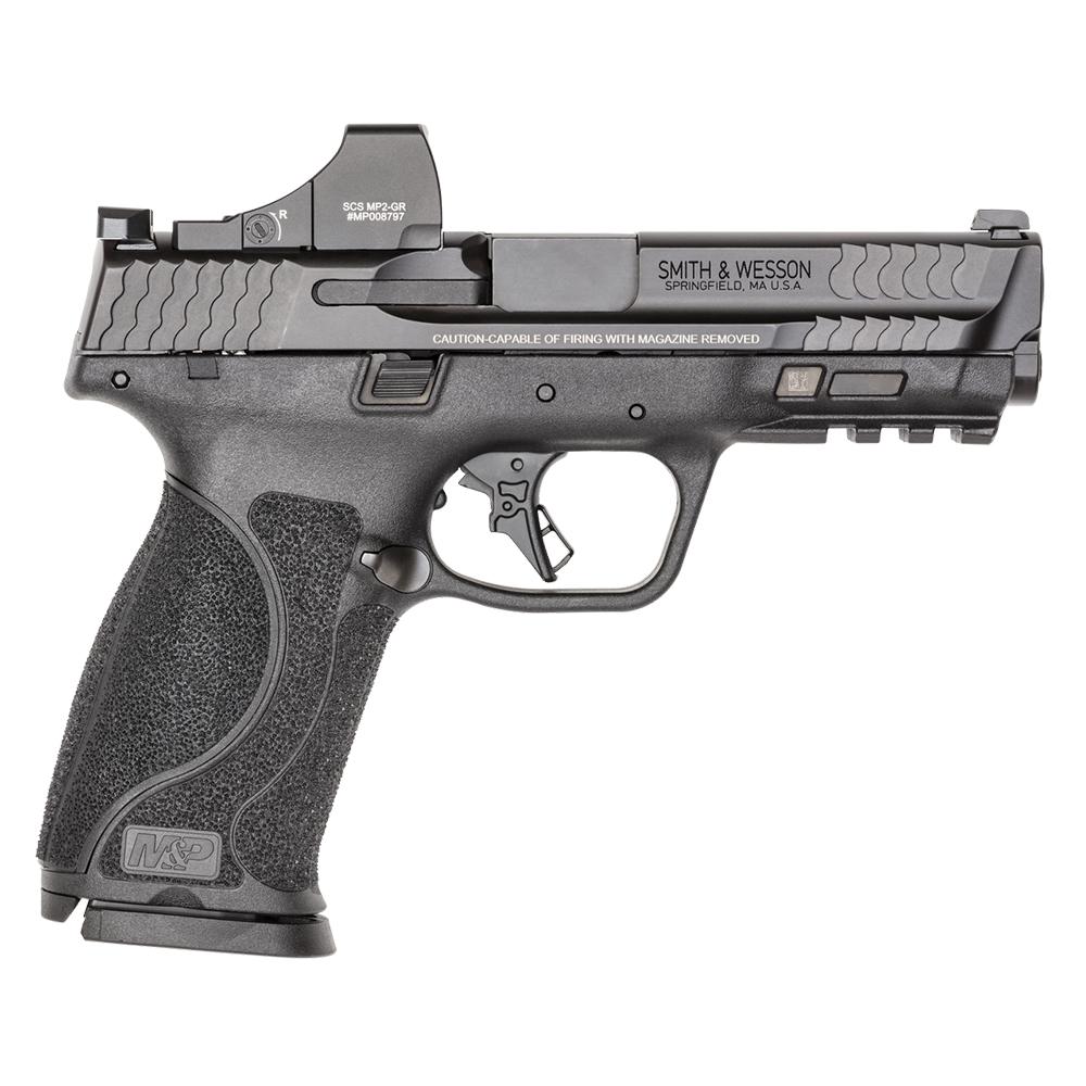 The M&P9 M2.0 with HOLOSUN Optical Sight LE Combo. It features an 18-degree grip angle for a more natural point of aim and better recoil management. Plus, the new flat-face trigger allows for consistent finger placement for accurate, repeatable, and comfortable shooting. Pistol has a 17+1-round capacity and comes with night sights. The compact HOLOSUN SCS-MP2-GR (Solar Charging Sight) is designed to attach directly to the slide of the M&P M2.0 pistol without a C.O.R.E. plate and uses the innovative solar charging system with multi-directional light sensors to automatically adjust brightness in dynamic situations. Because of the direct mount design, the M&P pistol and Holosun optic co-witness with standard height iron sight.
