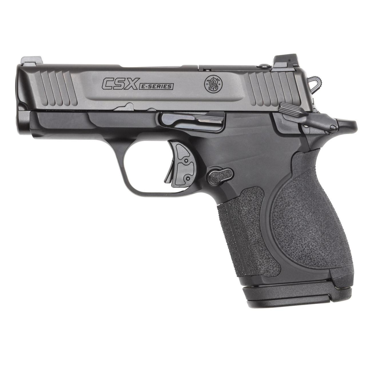 The Smith & Wesson CSX E-series is the next evolution in the CSX line. It boasts an enhanced E-Series trigger with a clean break and reset, extensive grip texture coverage, and a modular grip adapter that converts from micro-compact to compact frame size. This optic-ready pistol is chambered in 9MM and offers a 10-round capacity with a compact flush-fit magazine.