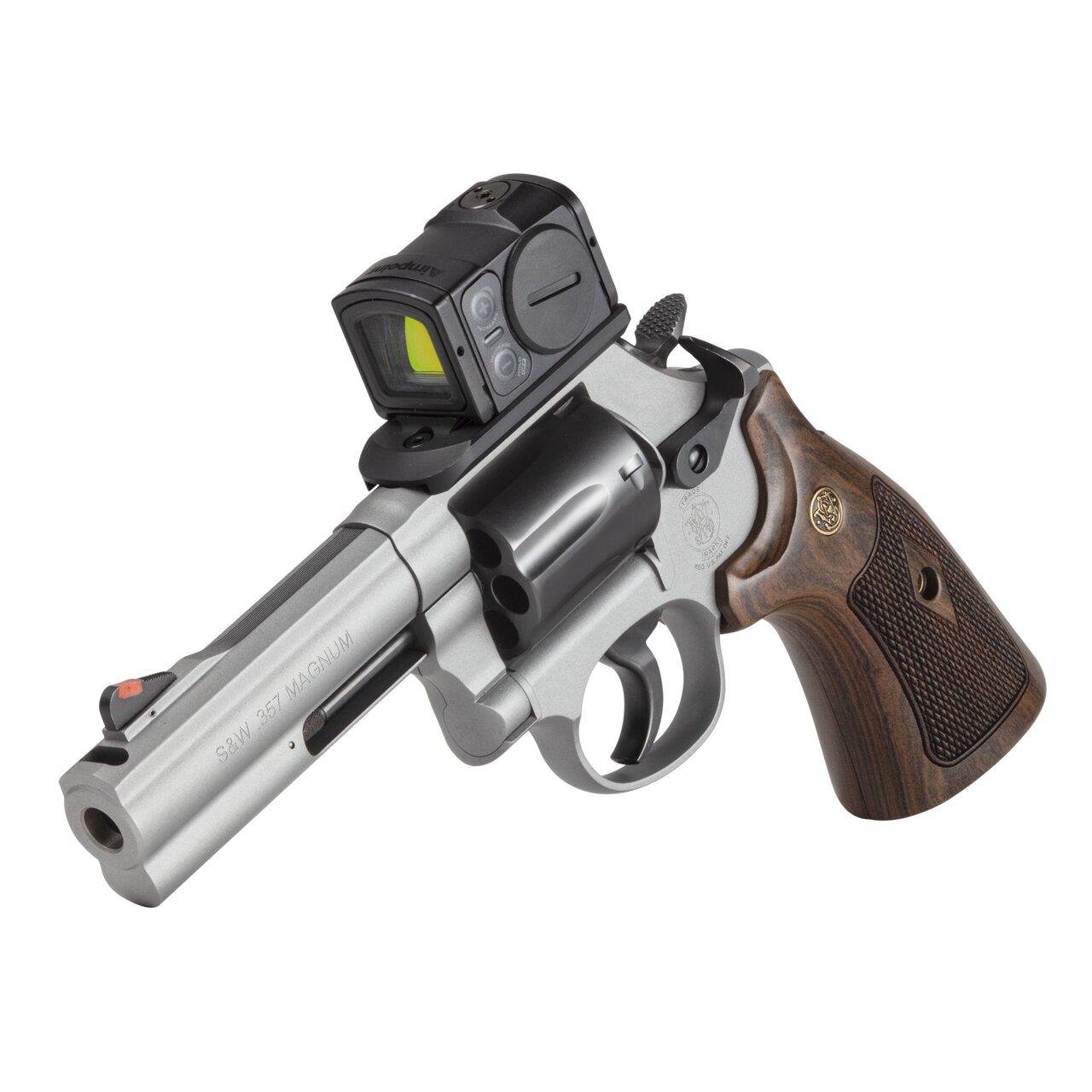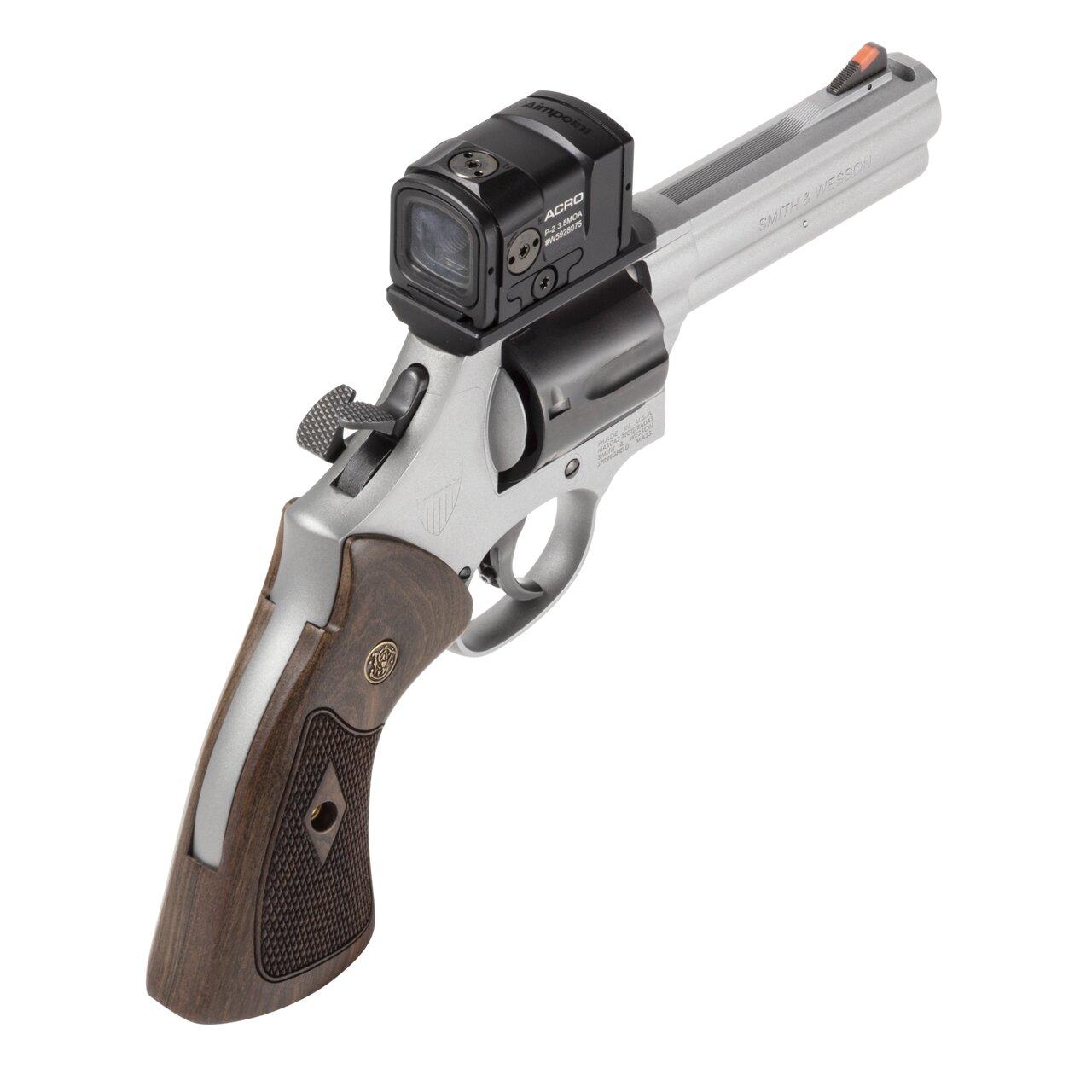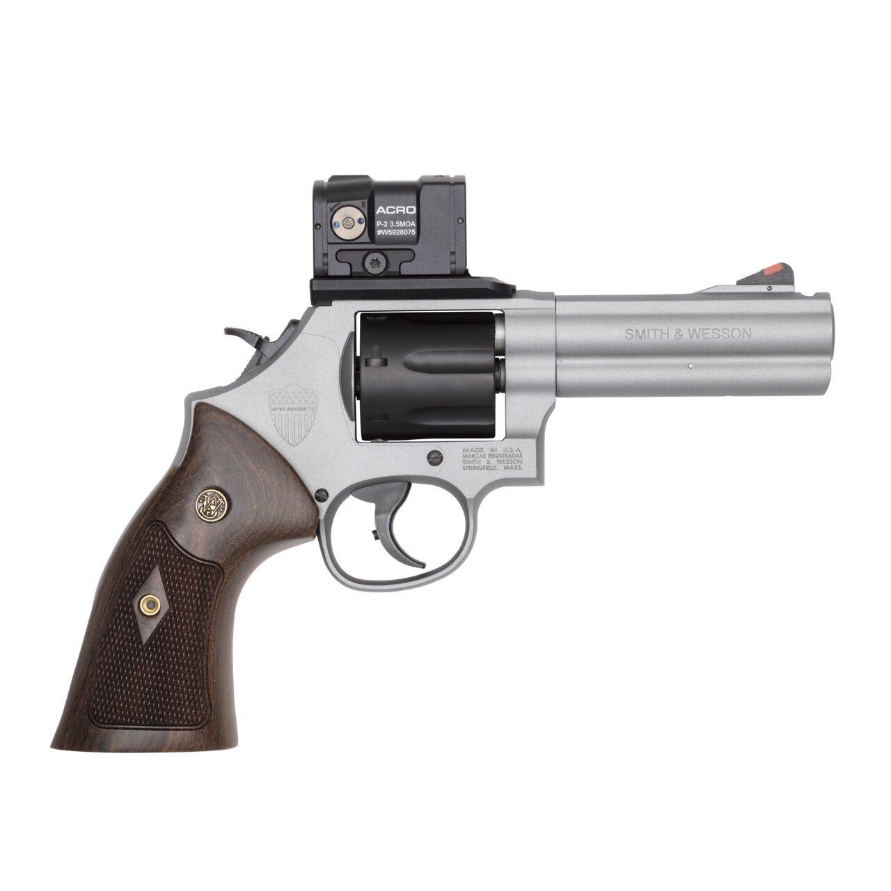 Introducing our first revolver in the Spec Series family – the Model 686 Plus Spec Series R. A perfect blend of classic aesthetics with modern enhancements. Enhanced features like the PowerPort™ reduces felt recoil so you can return to target faster, and get a quick sight picture with the Aimpoint® ACRO® P-2 that is mounted. Checkered wood grips give you great control when firing and add to the clean aesthetic of the revolver. Continue to push the boundaries with the new Spec Series R.