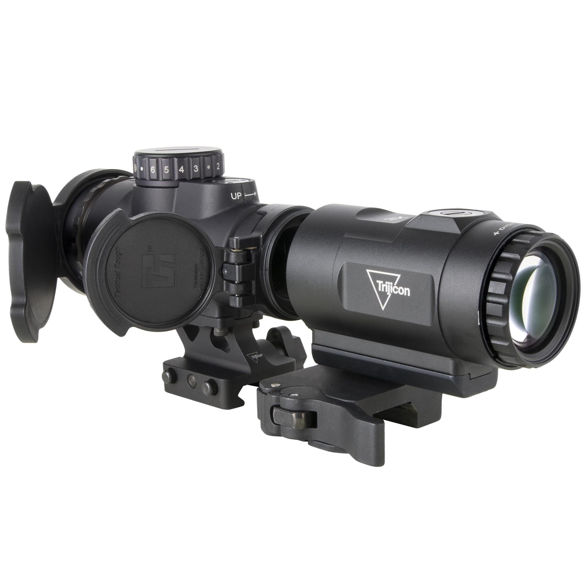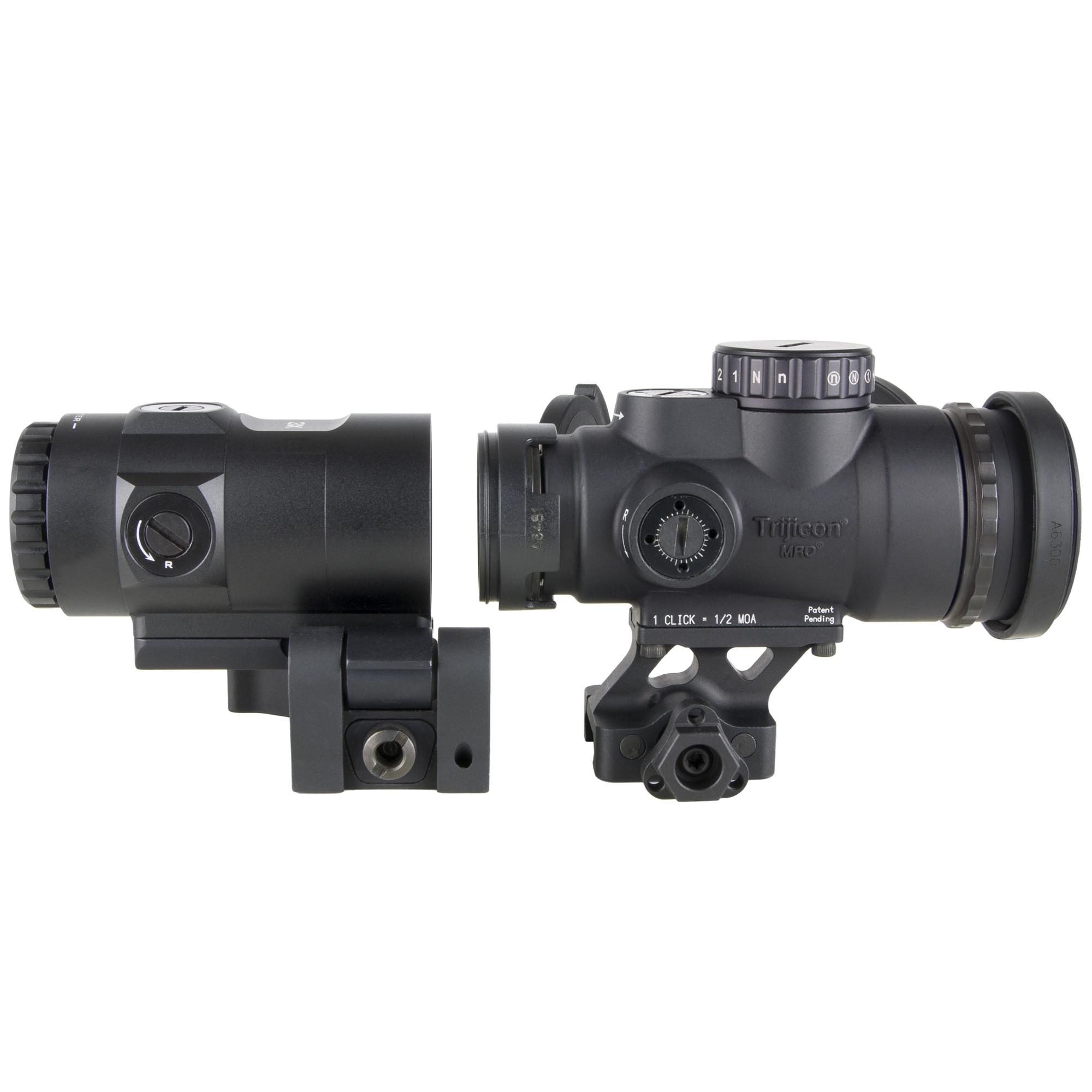 The Trijicon Miniature Rifle Optic (MRO®) HD Magnifier is a 3 power reflex optic magnifier specifically designed to magnify the target and target seen through the MRO HD red dot optic. By magnifying the target the shooter is able to use the crisp dot in the MRO HD to quickly and accurately engage targets at extended distances. The MRO HD Magnifier is short and compact which saves weight and rail space. The design features easy-to-set flush, toolless adjusters that make centering the reticle in the field of view easy. The adjustable diopter allows the user to tune the optical performance to their eyes.