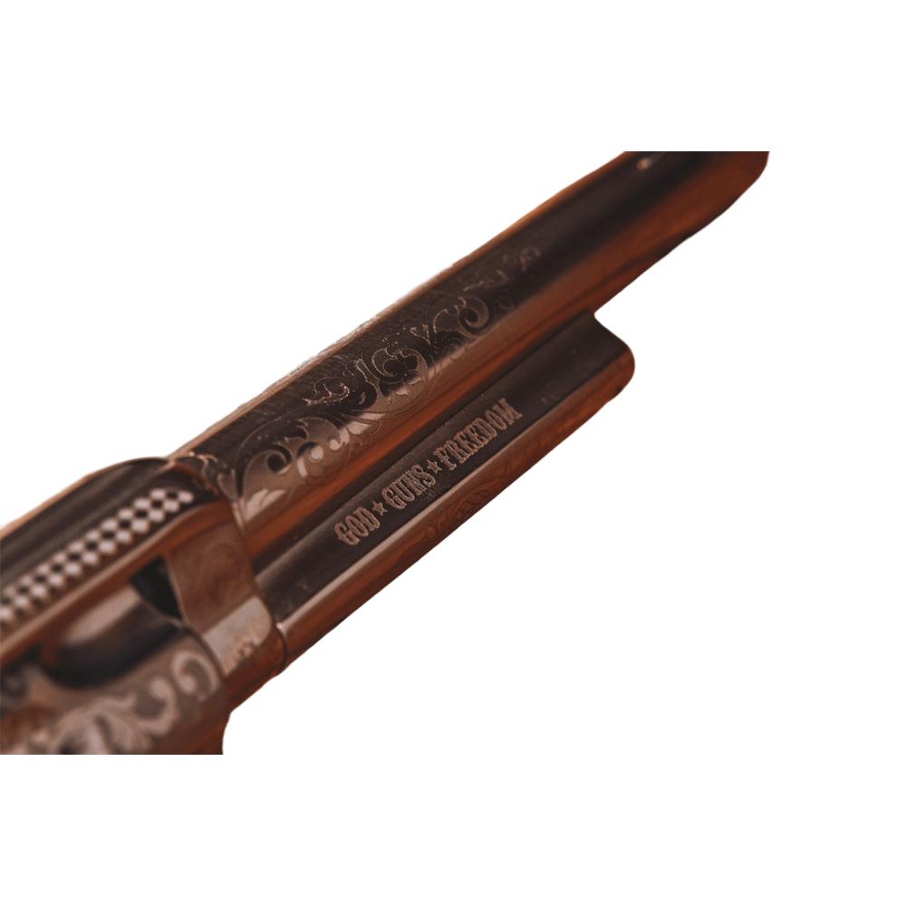 The Outlaw Legacy Revolvers were designed with the Outlaw Gang to combine beautiful finish features with their organization's slogan "God-Guns-Freedom". These revolvers are offered in cost effective beautiful finish options. The Outlaw Legacy Nickel Engraved features a nickel plated steel frame, nickel plated laser engraved parts, and a white polymer Navy size grip.