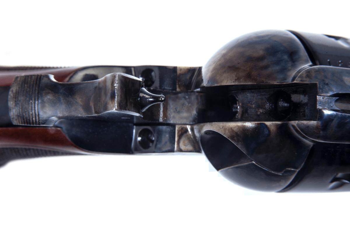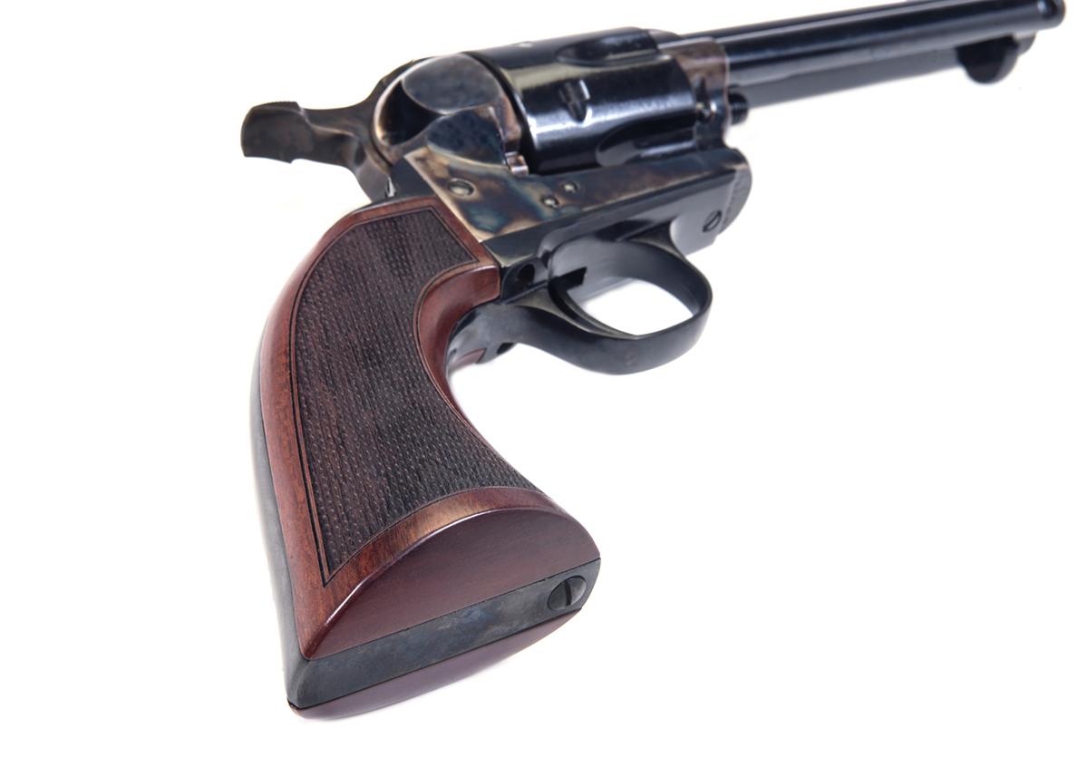 The Gunfighter Defender is a perfect combination of the original Gunfighter features and the favorite lowered Runnin' Iron® hammer. Taylor's installed the favorite 1860 Army grip onto the new model frame cattleman to accommodate the larger hand shooter. The Army grip is longer and slightly wider than the smaller Navy grip that is usually found on 1873 single action models. This checkered model features a case hardened forged steel frame, blued steel parts, lowered hammer spur, and a checkered Army Size walnut grip.
