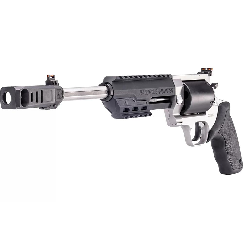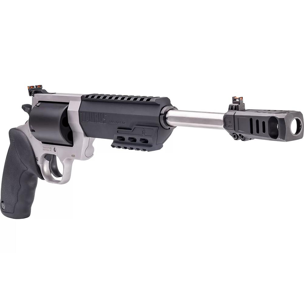 Winner of the 2019 American Hunter Handgun of the Year Golden Bullseye Award, the Taurus Raging Hunter is a next-generation, big-bore revolver that's first in innovation-and built to last. A fun and effective alternative for short- to medium-range hunting scenarios, this five-shot revolver is chambered in 460 S&W Magnum and is available in Matte Black or Two Tone finish. Its revolutionary angular barrel design cuts down on overall weight, while its factory tuned porting and gas expansion chamber reduces muzzle lift for quicker target acquisition. Cushioned insert grips ensure a comfortable, controllable shooting experience.