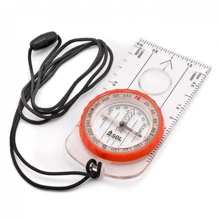 Enjoy the journey while using the SOL Deluxe Map Compass on your next adventure. Use the magnifying glass to zoom in on the tiny details of your map. Adjust your reading for True North with the fixed declination so you stay on course. The liquid-filled capsule with a luminescent ring and needle ensures stable and consistent readings even in dim light. The metric and imperial rulers on the beveled edges of the baseplate help you get an accurate map reading. All this rests on the extended baseplate with a rounded edge that sits comfortably in your palm. Never miss another key waypoint or landmark for a photo op with the SOL Deluxe Map Compass to guide you. To be used in the northern hemisphere only.