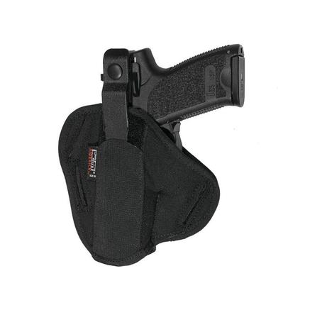 Efficiently retains concealed, shrouded or spurless hammered guns. Holds 2" five shot revolvers using an internal retention mechanism. Internal locking device fits into revolver trigger guard. A separate sewn down retention strap fits positively over gun frame. Kodra nylon is highly abrasion resistant as well as water resistant.