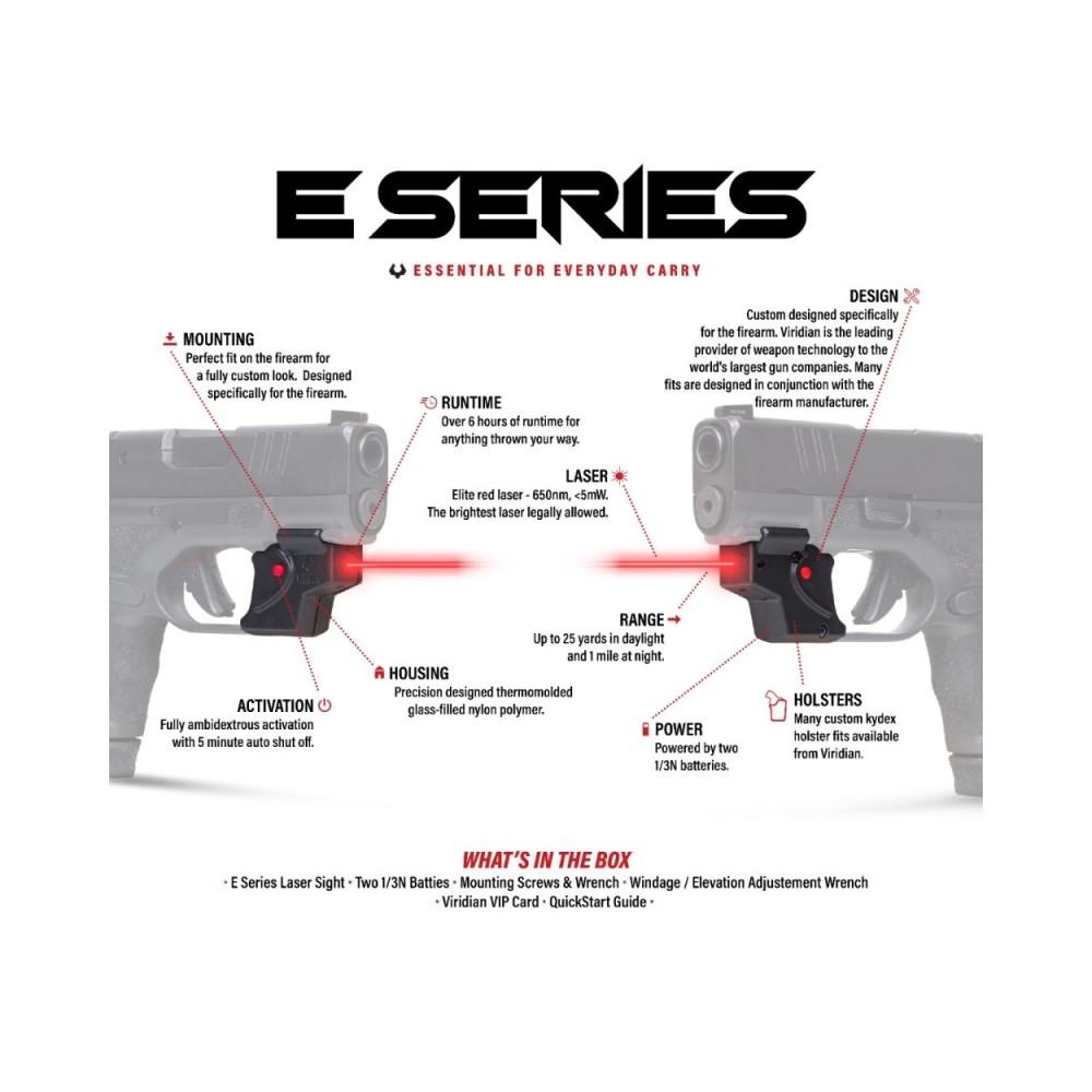 Viridian's E SERIES laser sight is specifically designed for the everyday conceal and carry owner. This model specific, trigger guard mounted, laser sight offers the most powerful red laser legally available, delivering rapid target acquisition when you need it most.
