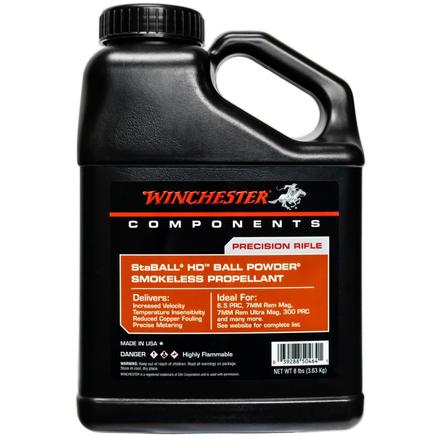 Winchester StaBALL HD is a temperature-insensitive, double-base, BALL Powder, stable in extreme-hot or -cold conditions. This slow-burning magnum powder provides optimal loading density in large capacity magnum cartridges appropriate for the burn speed, which is ideal for 6.5 PRC, 7MM Remington Mag, 300 PRC and many more. Typical of a BALL powder, precise metering contributes to improved velocity and lower standard deviations, ingredients that are paramount to match grade accuracy!