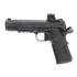 The 1911-XFULL ROMEO-X models feature a factory installed ROMEO-X red-dot sight from SIG SAUER Electro-Optics; the optics is crafted from 7075 aircraft-grade aluminum featuring machined anti-reflection grooves on shooter-facing surfaces with distortion-free aspheric glass and a patent-pending Beryllium Copper flexure-arm adjustment system. The ROMEO-X incorporates a high-efficiency point source red LED emitter with 2 MOA dot / 32 MOA circle reticle, side independent brightness adjustment buttons, 15 brightness settings including night vision settings, and a side-mounted CR1632 battery compartment with a threaded battery cap so the optic does not need to be removed from the pistol for battery changes. Additionally, the ROMEO-X offers a low deck height for standard-height iron sight co-witness, has a minimum continuous runtime of 20,000 hours at medium brightness setting and utilizes MOTAC (Motion Activated Illumination), MAGNETAC™ (Magnetic Activation), and D.A.R.C™ (Dark Adaptive Reticles & Coatings) technologies.