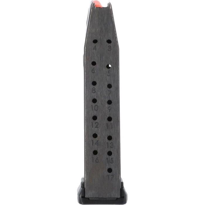 Factory 17-round steel magazine for the P365-AXG LEGION pistol featuring the Henning group Aluminum basepad. This magazine includes rear witness holes to confirm loaded capacity and an orange follower making it easy to identify when unloaded.