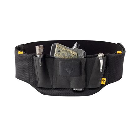 A Hard Laminate Trigger Shield protects the firearm's trigger from unwanted intrusion. The Belly Band has two Elastic pockets for spare magazine, knives, flashlights and, pepper spray. Two Secure YKK Zippered Storage Pockets are great for credentials, cash, keys and can double as a phone holder.
