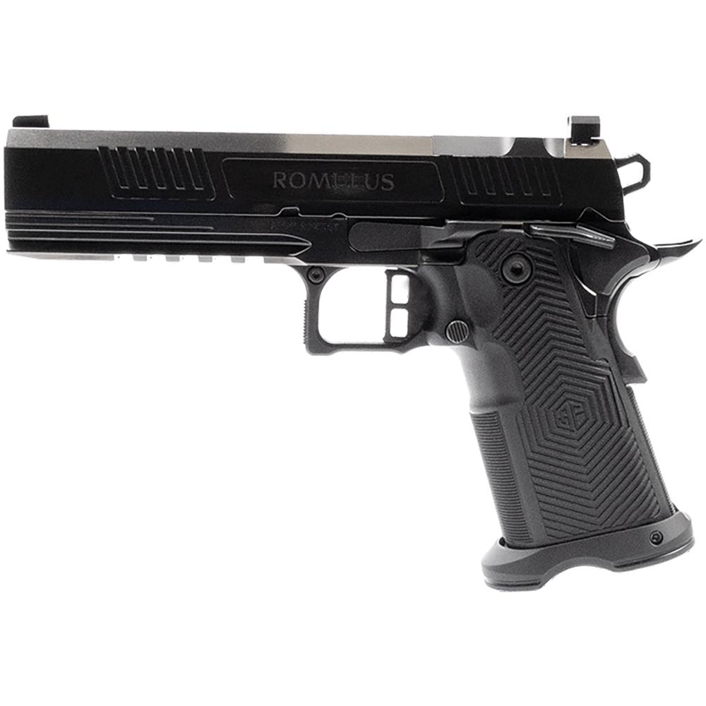 F1911 ROMULUS, HAMMER FIRED, SLIDE AND FRAME ARE SUS416 BLACK POLISHED DLC FINISH. ULTRA MATCH 416R BUTTON RIFLED BARREL, 1:10 RH 6 GROOVE. INJECTED POLYMER GRIP MODULE, EXTENDED BEAVER TAIL, 19 ROUND DOUBLE STACK MAGAZINE, GLOWING NIGHT SIGHTS, EXTENDED SLIDE RELEASE, FLARED MAGWELL, ACCESSORY RAIL, PICATINNY, RMSC OPTICS CUT, AMBI-SAFETY. 100% MADE IN AMERICA