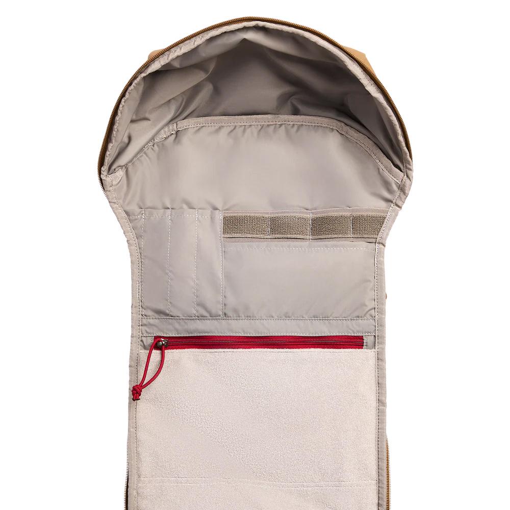- Inside Main compartment reveals double-layer, loop-lined laptop sleeve with layers of organization—translucent mesh pockets, admin slots, stretch pockets, and loop elastic