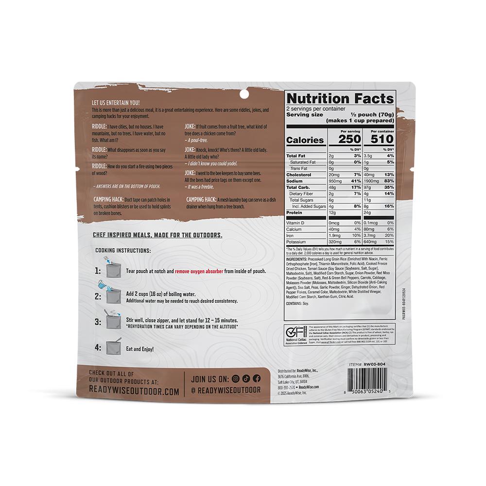 Each pouch of Teriyaki Chicken and Rice contains 2.5 servings and is resealable. These pouches are lightweight making the easily portable for any outdoor adventure. Just add water and you can eat directly from the pouch.
