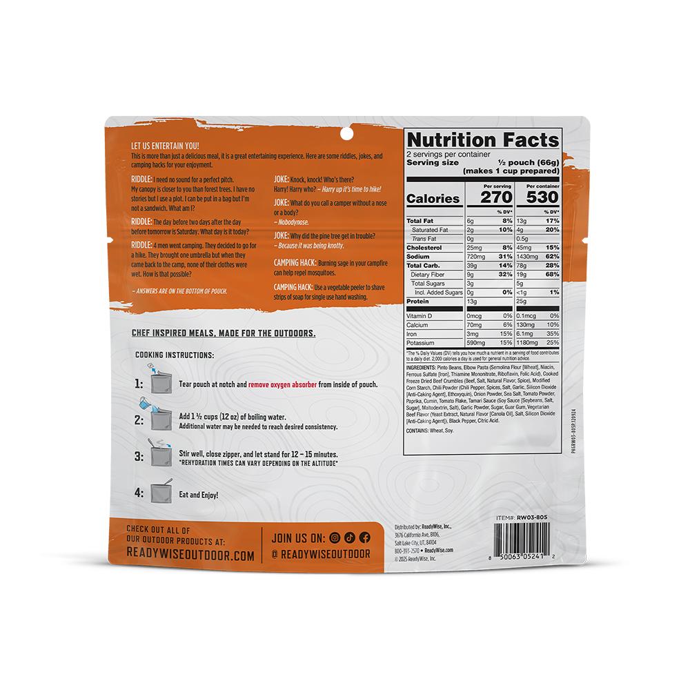 Each pouch of Chili Mac with Beef contains 2.5 servings and is resealable. These pouches are lightweight making the easily portable for any outdoor adventure. Just add water and you can eat directly from the pouch.