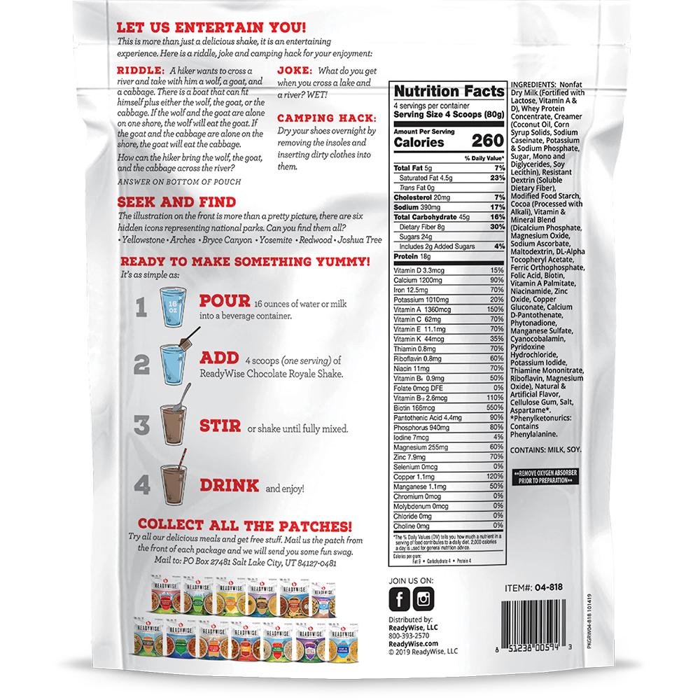 Each pouch of our Chocolate Royale Shake contains 2 servings and is resealable. These pouches are lightweight making them easily portable on any outdoor adventure. Just eat directly from the pouch!