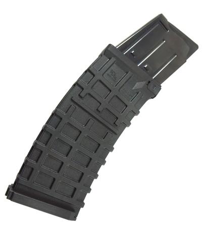 - Hybrid design magazine body constructed of heat treated carbon steel upper feed tower and injection molded polymer magazine lower body extension