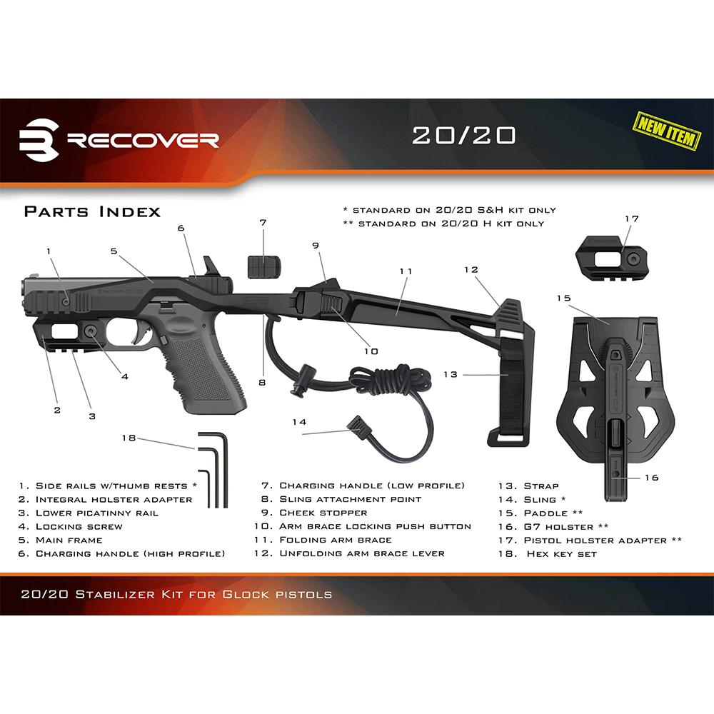 Enhance the stability and performance of your Glock with the Recover Tactical 20/20N Pistol Brace Stabilizer Kit. This innovative kit is compatible with all 9mm and .357 Double Stack Gen 1-5 Glock pistols, including popular models like the Glock 26 and Glock 27, as well as all Double Stack Gen 1-4 SW40 Glocks. Designed for easy installation, the kit provides improved accuracy and control without the need for NFA registration when you select the TFA Kit version. Available in brace or stock options (with NFA rules applicable), this high-quality stabilizer kit is perfect for shooters looking to get the most out of their Glock. Rated 4.96 out of 5 stars, it’s a proven favorite among Glock owners! Covered by US Patents US11306996B2 and US Patent 11592262